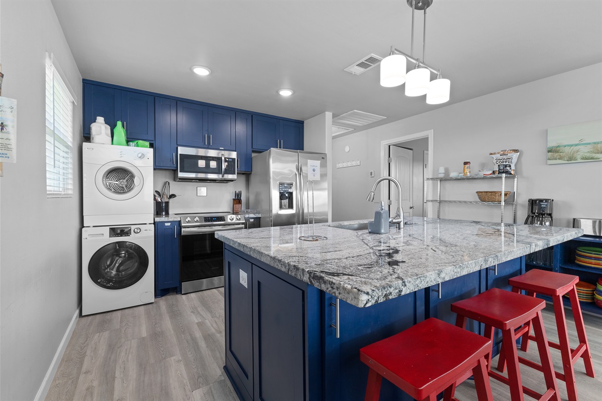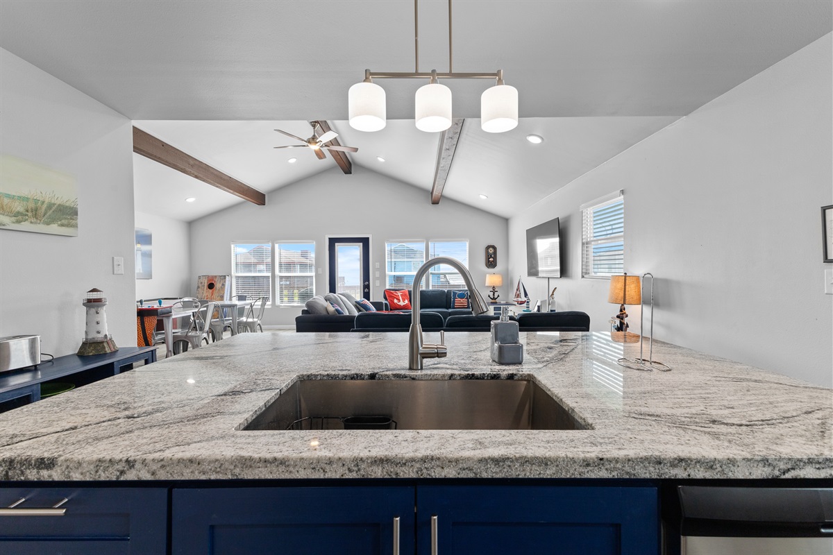 The layout of the beach house is great! Spacious and comfortable, your family will enjoy spending time in the open living, dining, and kitchen areas. In the living area, you'll find comfortable seating, a 65" flat screen Smart Roku TV with streaming capabilities (no Cable TV package), NBA Jam arcade game, a brand new 12’ shuffleboard, two tables for games, puzzles, activities, and dining. Additional seating is available at the breakfast bar.